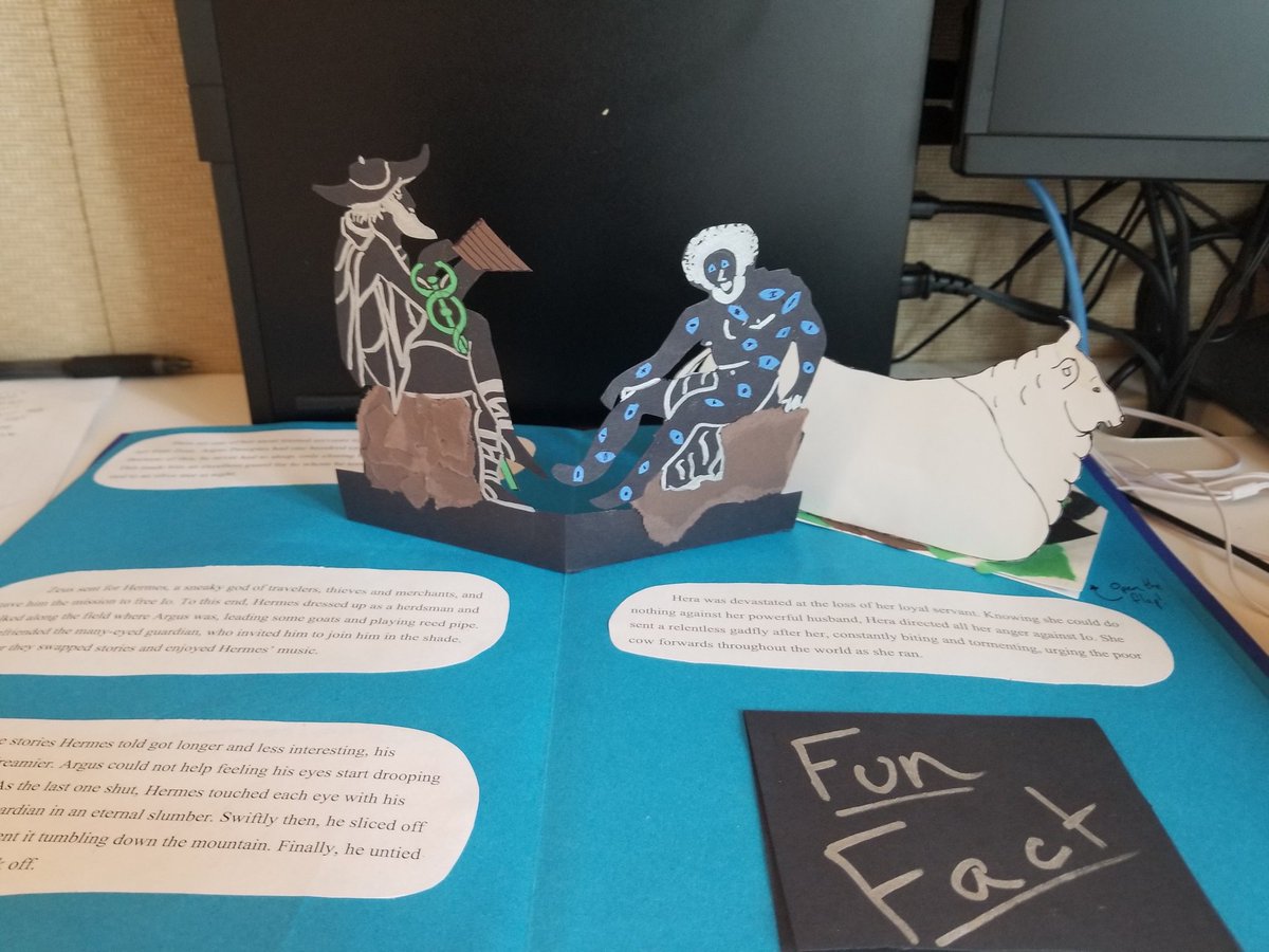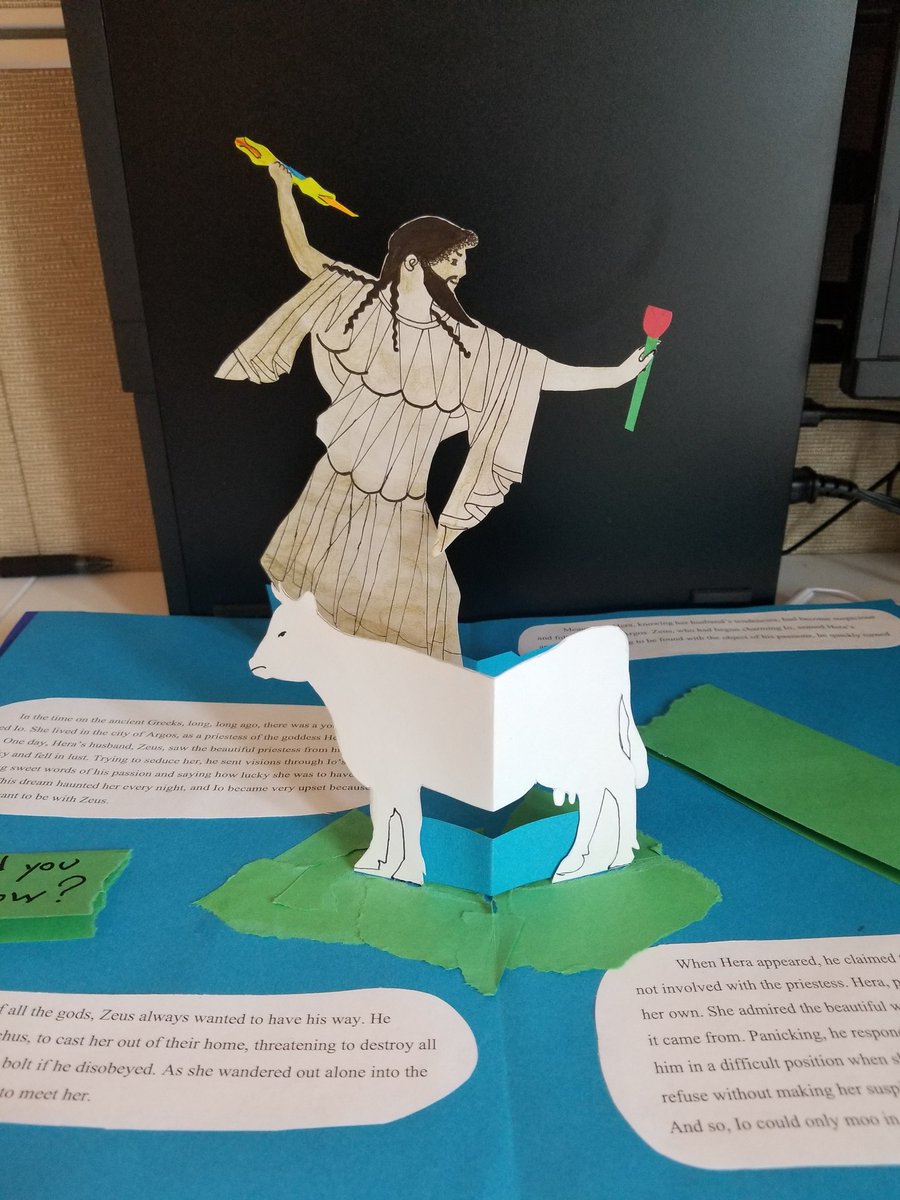 Students were given several class periods to discuss and design projects that would allow them to engage with classical myth in a meaningful way combining research methods used in the course with their own interests and ideas about how myth functions and can be adapted in the modern world. Students had the option of writing a conventional research paper (8-12 pages) or doing a creative project accompanied by a short essay explaining how they did their research and why they made the choices they did. Students discussed their projects with the class during the final period. N.B. All projects below are shared with student permission and are samples, not the entire project.